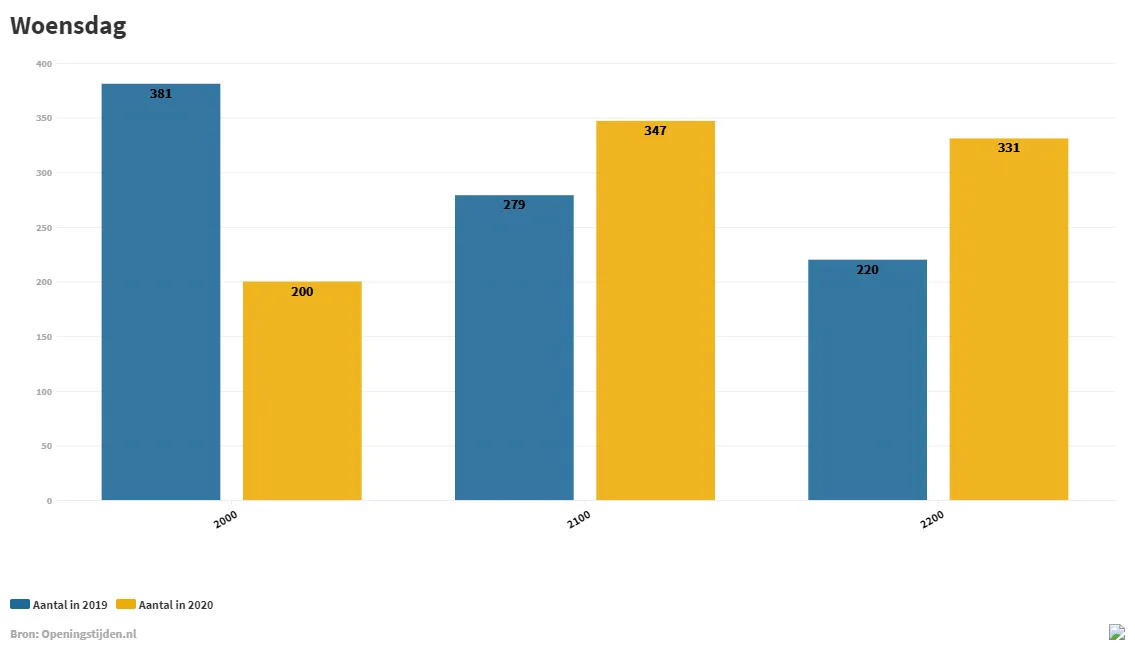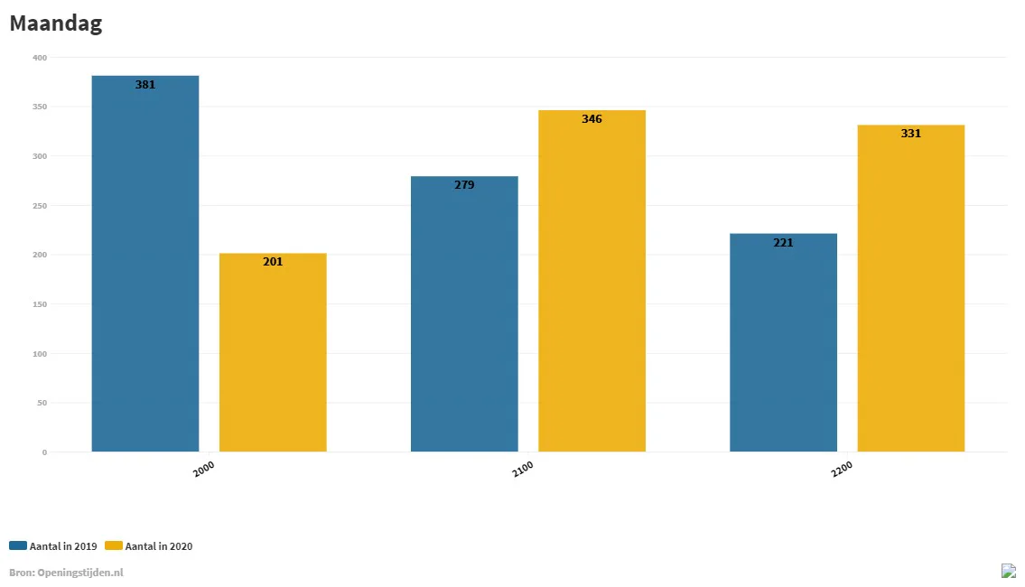 Openingstijden.nl maakte ook een analyse van iedere dag afzonderlijk. Hieruit blijkt dat met name op zondag de openingstijden zijn verruimd. Waren er in 2019 in totaal 110 open tot 22.00 uur, in 2020 zijn dat er 183. Het aantal vestigingen waarvan de openingstijd op zondag is verruimd naar 21.00 uur is bijna verdubbeld, van 49 naar 94. Op alle andere dagen in de week is de groep AH’s die tot 22.00 uur open zijn met ongeveer 50 procent gegroeid.